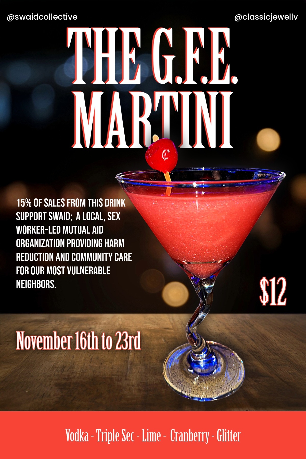 In addition, Classic Jewel, another Las Vegas hotspot, will be serving a special SWAID alcoholic beverage from November 16th to 23rd. 15% of the sales from the drink, called The GFE Martini, will be donated to SWAID. Classic Jewel is located at 353 E Bonneville Ave #111, Las Vegas, NV 89101.